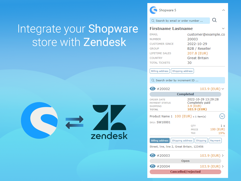 The Shopware 5 Connector for Zendesk Support and Chat will allow you to connect your Shopware 5 stores and display customer information on the Zendesk side.