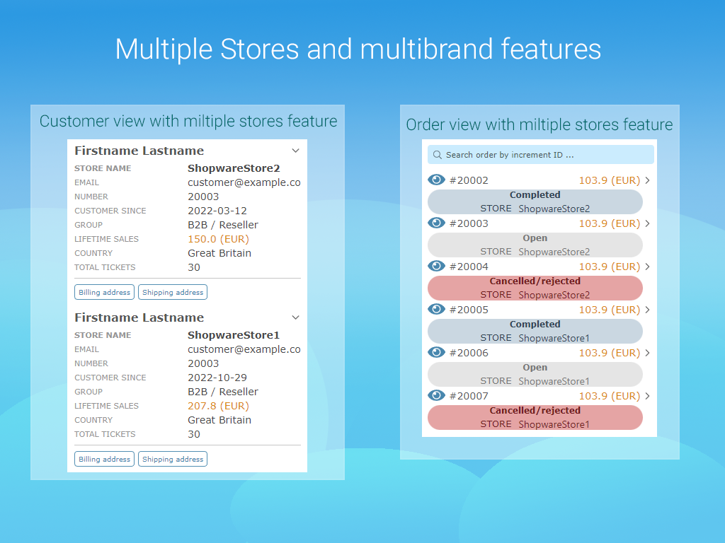 The application by default uses the ticket requester email for searching and looks for information on the Shopware 5 store. Found information is divided into detailed data about the customer and all orders associated with this customer. In addition, the application can connect several Shopware 5 stores at the same time and display information for each store. Note: You should purchase the extension for each store which will connect to the app.